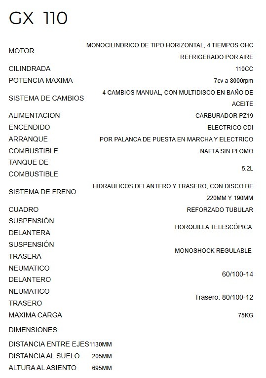 Descripción La atractiva GX110 ha sido diseñada para ofrecer a los jóvenes pilotos una facilidad de conducción todo terreno. Su motor 4T de 110cc ofrece una suave pero constante entrega de potencia para una diversión sin límites. Con Su increíble suspensión invertida regulable, hace que cualquier tipo de terreo no sea un obstáculo ofreciéndole al piloto un excelente confort de manejo. Las dimensiones hace que sea una moto muy ágil de manejar, es compacta liviana y adaptable a cualquier piloto gracias a sus amortiguadores delanteros y el trasero regulables en altura y dureza, es ideal para aquellos jóvenes de 14 años atrevidos que se quieren iniciar en el todo terreno.