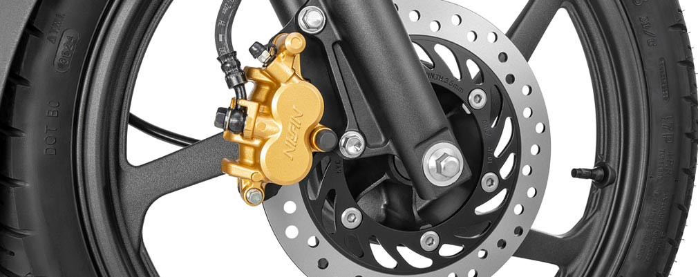 | SEGURIDAD | El disco de freno delantero de 240mm de diámetro ahora está accionado por una pinza Nissin de dos pistones. Además, el nuevo sistema de frenos combinados (CBS), al distribuir el frenado en ambas ruedas, permite que las detenciones sean mucho más seguras. |