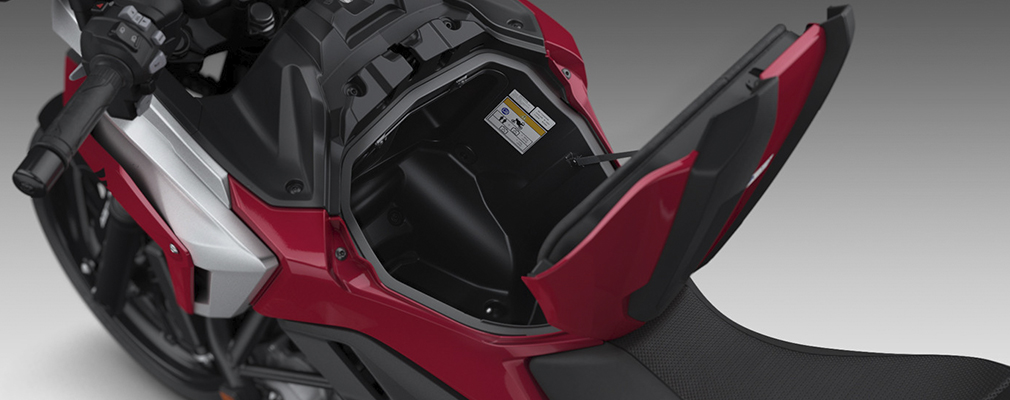 CONFORT Al diseño ergonómico, característico de la NC750X, se suma una disminución en la altura del asiento, garantizando un centro de gravedad más bajo que repercute en una posición de manejo más cómoda. El portaobjetos delante del asiento ofrece el espacio suficiente para un casco de doble propósito. La horquilla delantera sumada al monoshock Pro-Link trasero, ambos de 120mm de recorrido, están preparados para entregar sensaciones de manejo agradables sin importar el terreno.